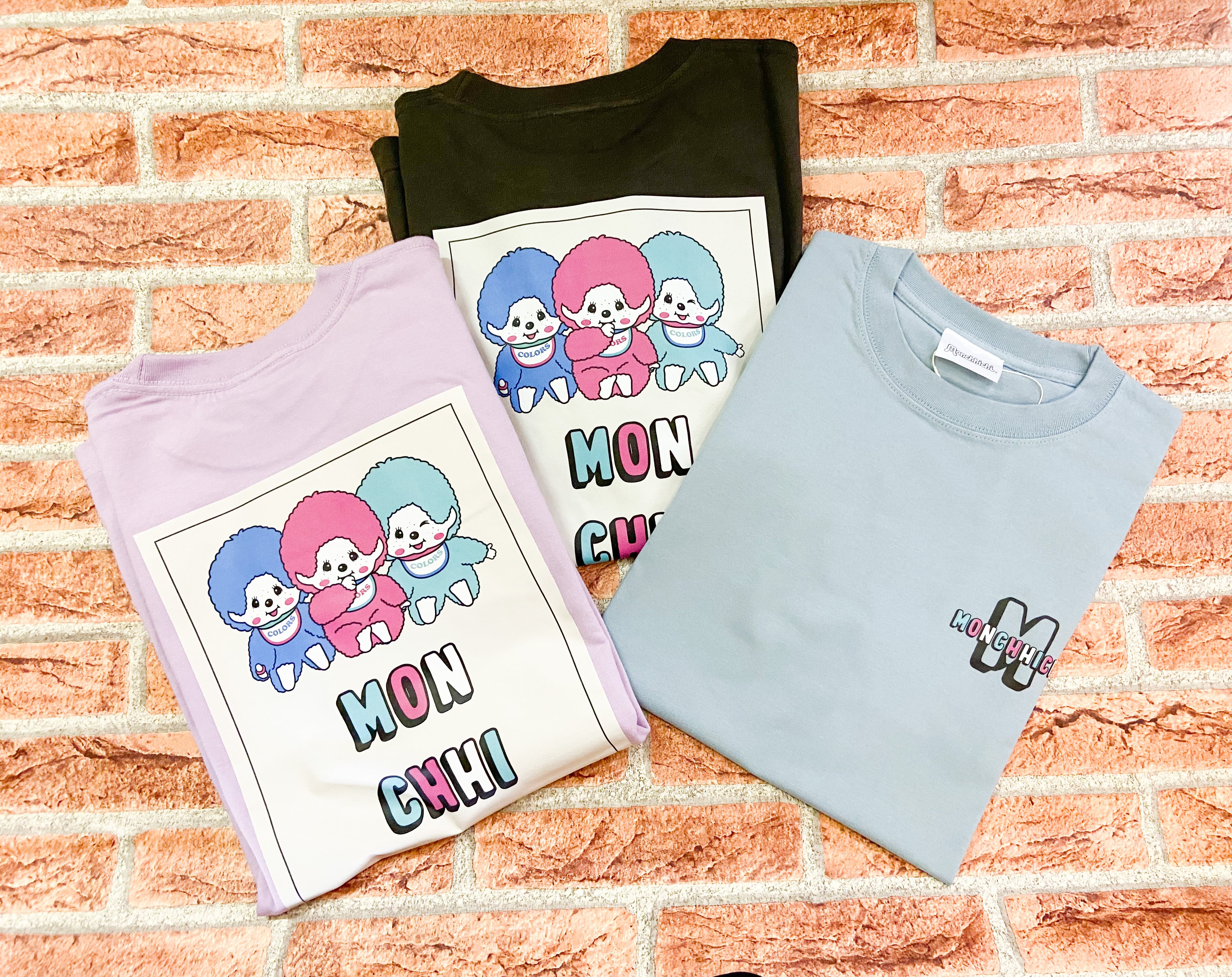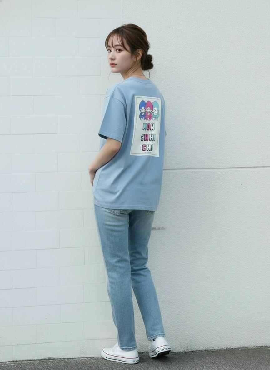 フロントは着回し力抜群のシンプルデザイン。バックには、カラフルなモンチッチたちが並ぶポップなアートワークを大胆に配した、前後で表情の異なる一着が登場しました。