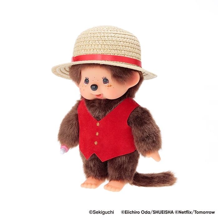 スタンダードなモンチッチに、ルフィのコスチュームをアイコニックに着せ付けた特別仕様。 オリジナルで型起こしした麦わら帽子に、スウェード調のシックな赤ベストを合わせ、作品の世界観を表現しました。