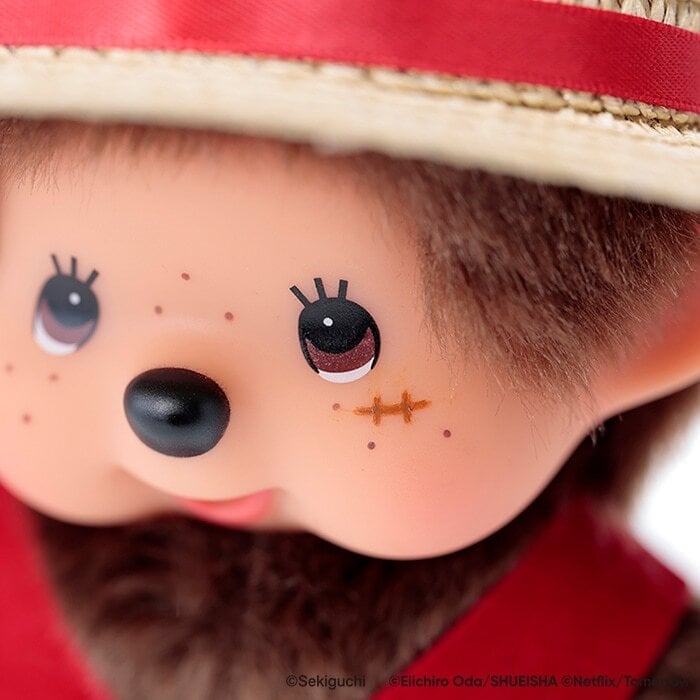 左頬には、モンチッチのそばかすの上からルフィの子供時代の傷をプリントで再現。 Sサイズはアクリルボアプラッシュを使用し、ふっくらとした豪華な仕上がりに。 SSサイズはポリエステルボアを採用し、くったりと柔らかな手触りが楽しめます。