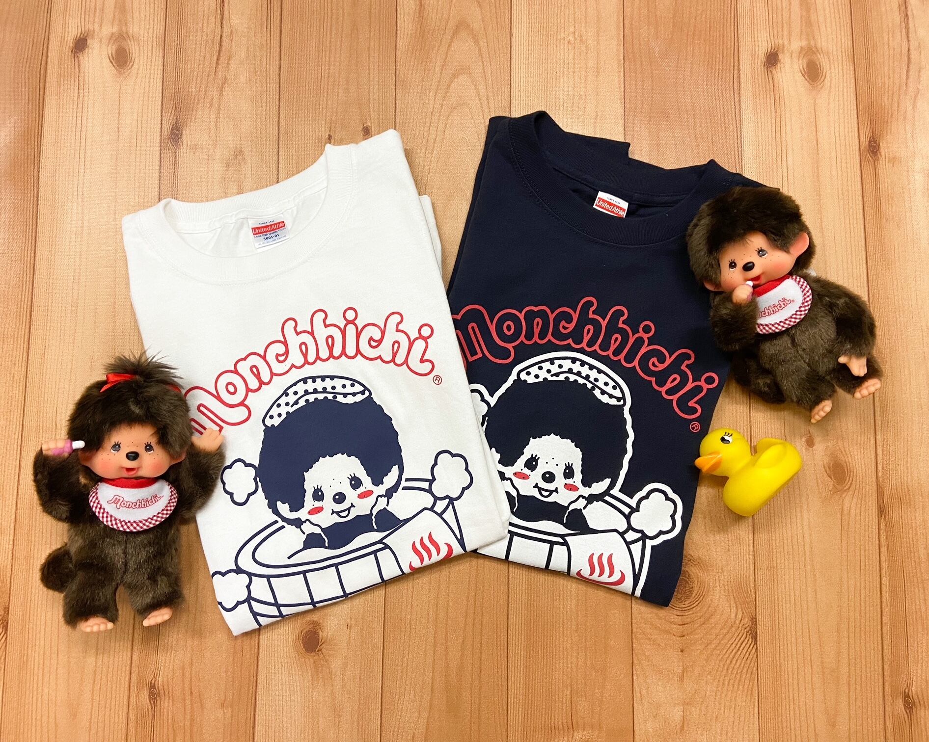 風呂桶の温泉を満喫しているモンチッチが癒される〜〜!しっかりした生地のTシャツです!弊社描き下ろしオリジナルデザインです★